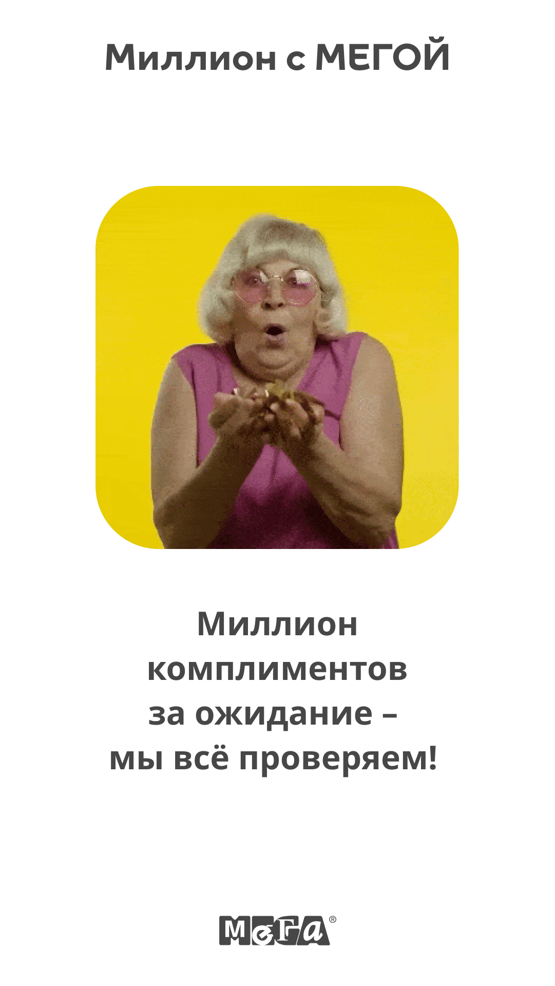 С 6 июня по 14 июля 2024 проходила акция «Миллион с МЕГОЙ». На старте бренд широко анонсировал во всех собственных каналах, что число участников программы лояльности приближается к миллиону, и предложил «подружиться» тем, кто еще не зарегистрирован в MEGA Friends. Далее МЕГА продолжала поддерживать знание об акции через посты в популярных соцмедиа, за коммуникационную поддержку отвечало агентство стратегических коммуникаций PBN.