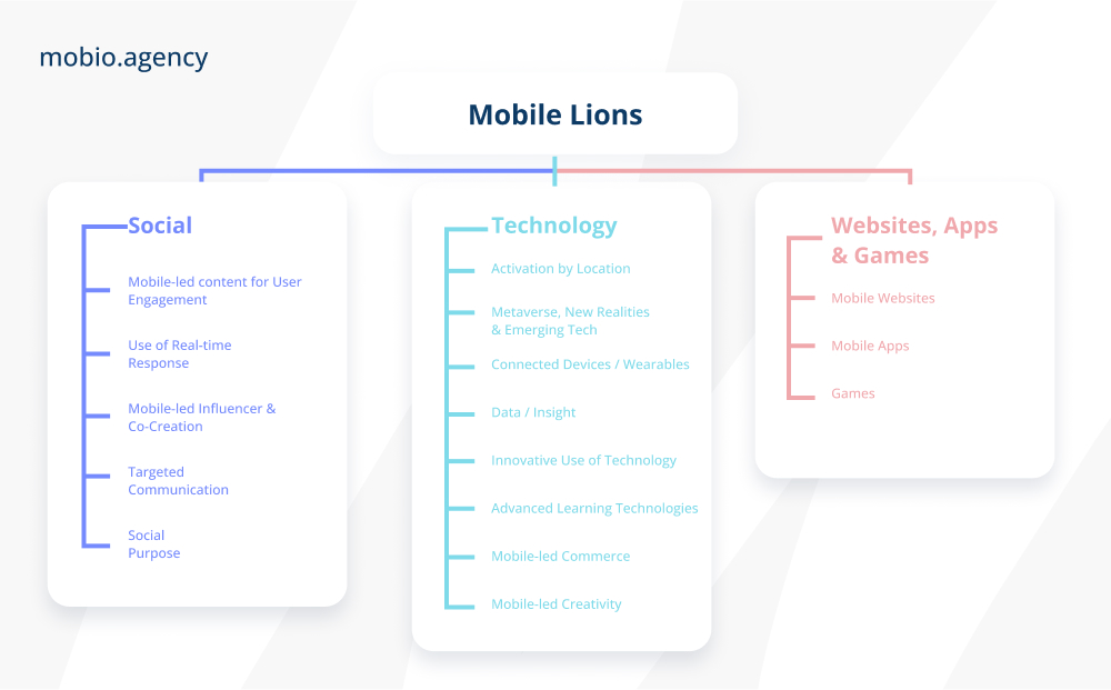 На фестивале 2023 соперничество за главные призы в секторе Mobile прошло под лозунгом «The Mobile Lions celebrate device-driven creativity». Борьба за награды происходила в следующих категориях: