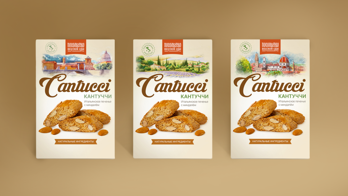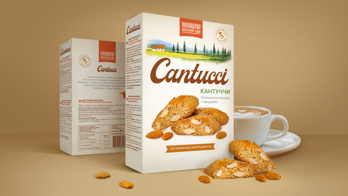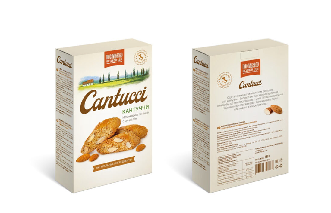 На основании выполненных исследований и аналитики для нового продукта «кантуччи» была выбрана концепция оформления упаковки в традиционном итальянском стиле, известного на весь мир своей изысканностью и элегантностью. Командой DS1 branding были предложены следующие концепции. Также целью агентства было продемонстрировать статусность и высокое качество продукта заказчика; отразить через разработанный имидж ценности, которые несет в себе печенье кантуччи: значимость неспешных минут, проведенных за чашечкой кофе. Командой DS1 branding были предложены следующие концепции.