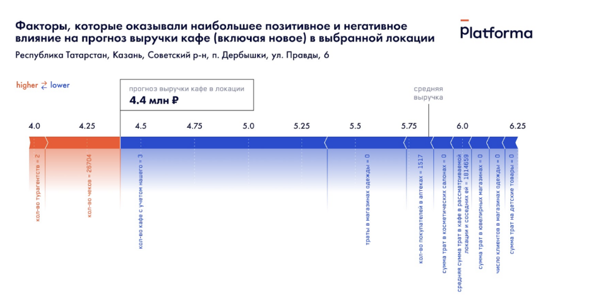К сожалению, кафе в данной локации тоже не обещает быть достаточно успешным — его прогнозная выручка составляет 4,4 млн рублей против 5,8 млн в среднем по городу. Количество конкурентов в локации (3 с учетом нашей точки) сильнее всего отрицательно повлияло на прогноз. Отсутствие покупок одежды, детских товаров, трат в салонах красоты, а также зоомагазинах также негативно повлияли на вероятность эффективности бизнеса в данном районе.