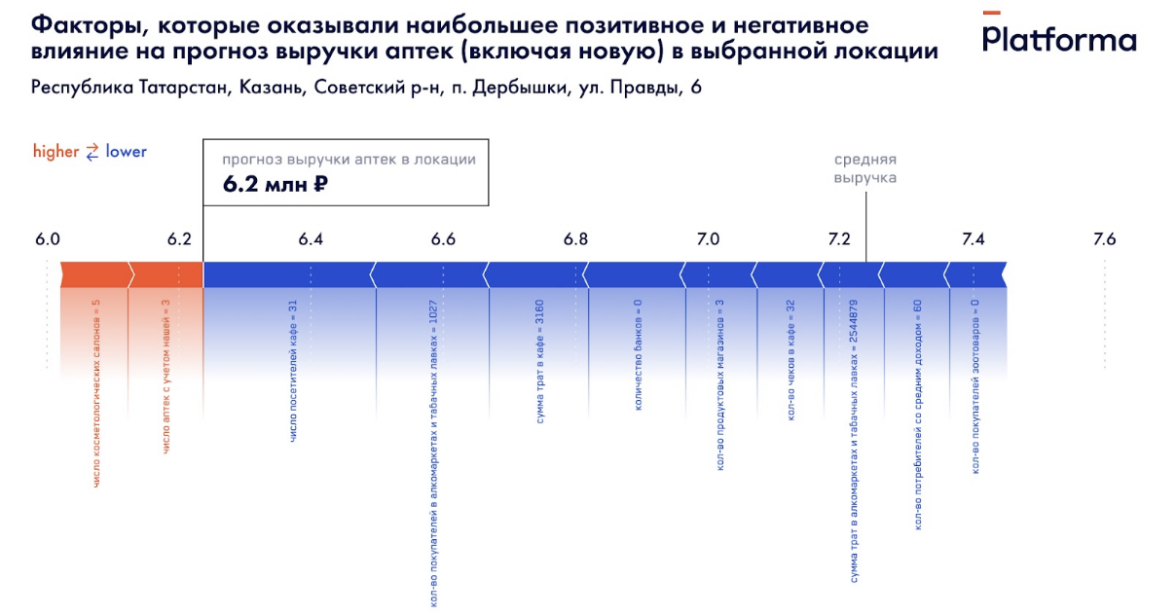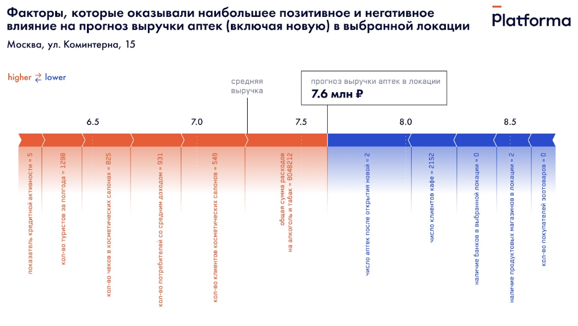 Как видно на графике, аптека в данной локации много выручки не принесет — ее прогнозный оборот, согласно данным нашей математической модели, около 6,2 млн рублей против почти 7,3 млн в среднем по городу. Наибольший отрицательный вклад в прогноз внесло небольшое число клиентов кафе и покупателей алкомаркетов. Также отрицательно на потенциальной выручке сказалось отсутствие банков в локации.