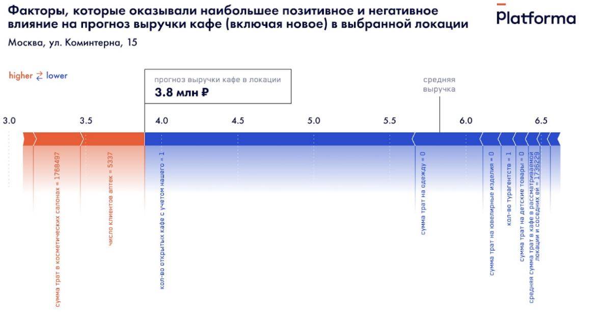 На графике отчетливо видно, насколько негативные факторы перевешивают позитивные и насколько прогнозная выручка для этой локации ниже средней — 3,8 млн рублей против 5,7 млн. Неожиданно, но именно отсутствие конкурентов «съело» большую часть прогнозной выручки — потребители не ищут здесь кафе, вероятно, оно им тут не нужно. Также в этом районе не тратят на одежду, ювелирные изделия и детские товары, а шоппинг нередко идет рука об руку с посещением кафе и ресторанов.