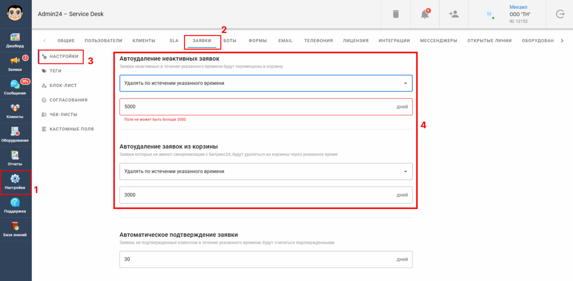 Произведена корректировка автоудаления заявок — максимальное время ожидания было увеличено до 3000 дней. Напоминаем, что настроить автоудаление заявок можно в разделе «Настройки» → «Заявки» → «Настройки» в блоках «Автоудаление заявок из корзины» и «Автоудаление неактивных заявок».