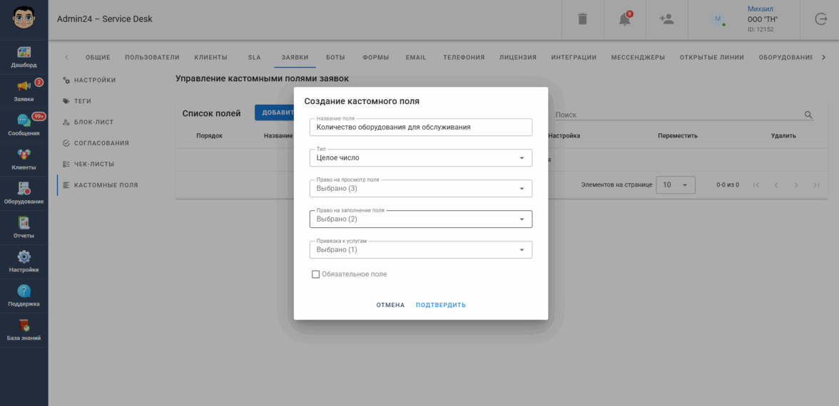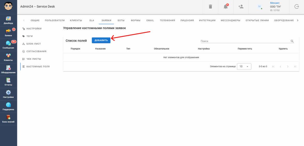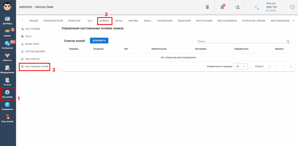 В обновлении был реализован функционал создания пользовательских полей в заявке. Для этого перейдите в «Настройки» → «Заявки» → «Кастомные поля».