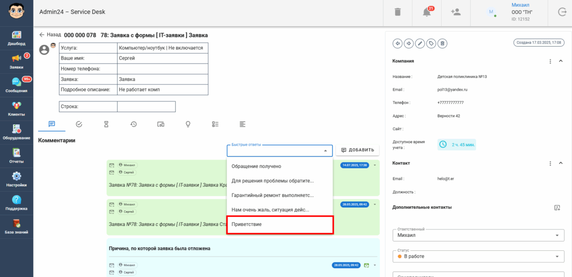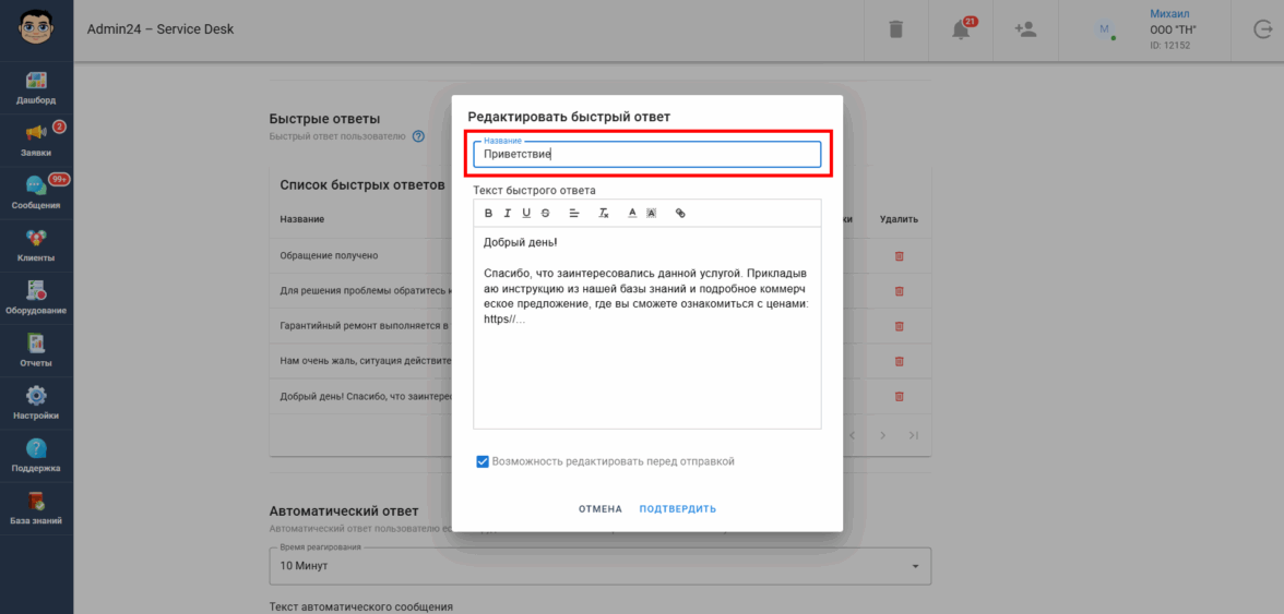 При добавлении или редактировании быстрого ответа вы сможете задать его название. Это позволит вам быстро выбирать нужный ответ из списка, не читая его полный текст. Например, вы можете задать быстрому ответу название «Приветствие» и отправлять его в ответ на заявку клиента: