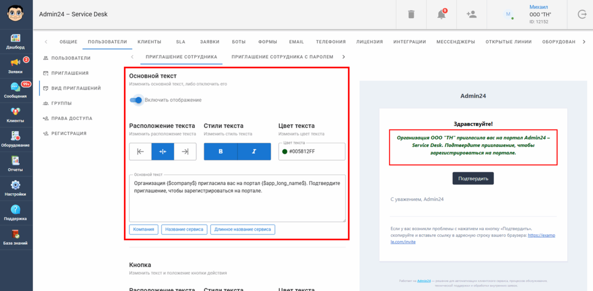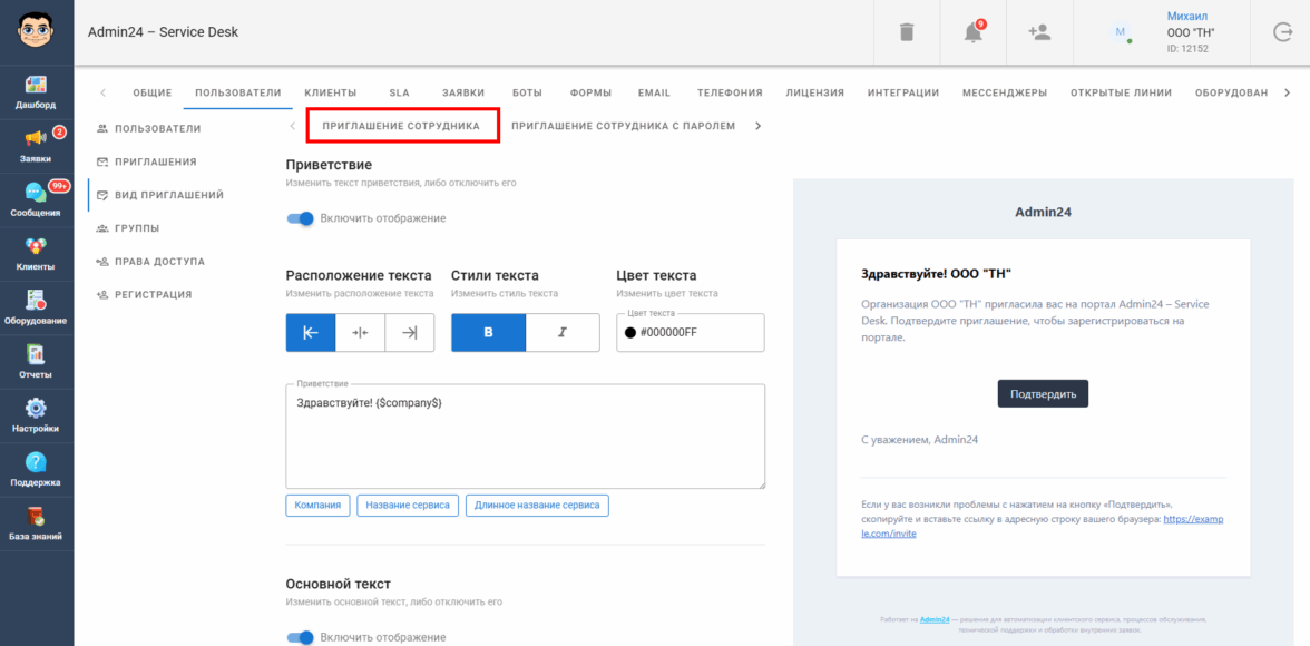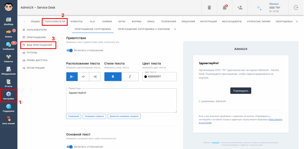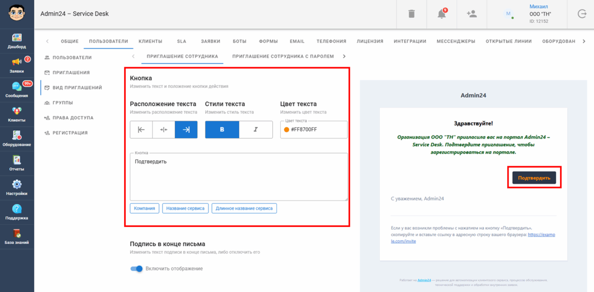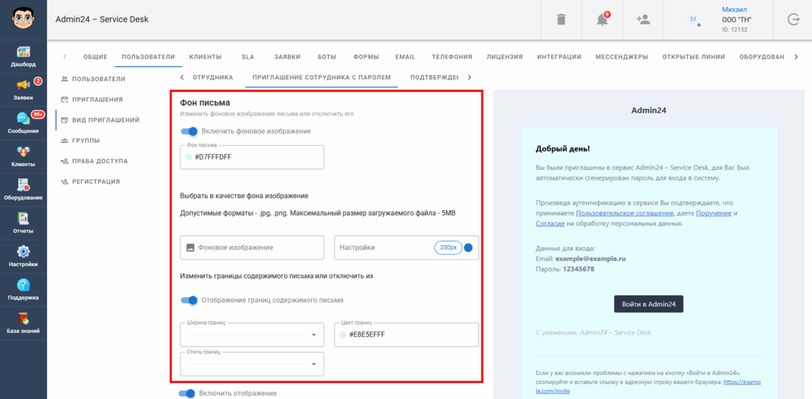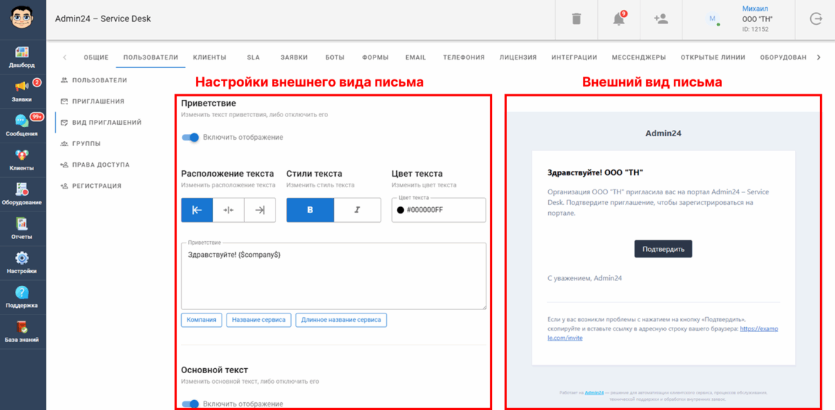 Теперь вы можете кастомизировать письма для приглашения пользователей. Для этого перейдите в раздел «Настройки» → «Пользователи» → «Вид приглашения».