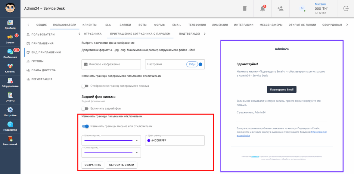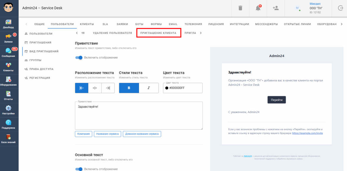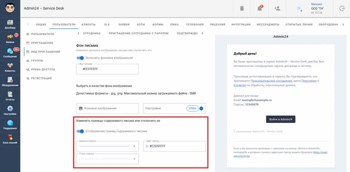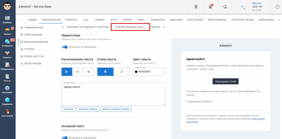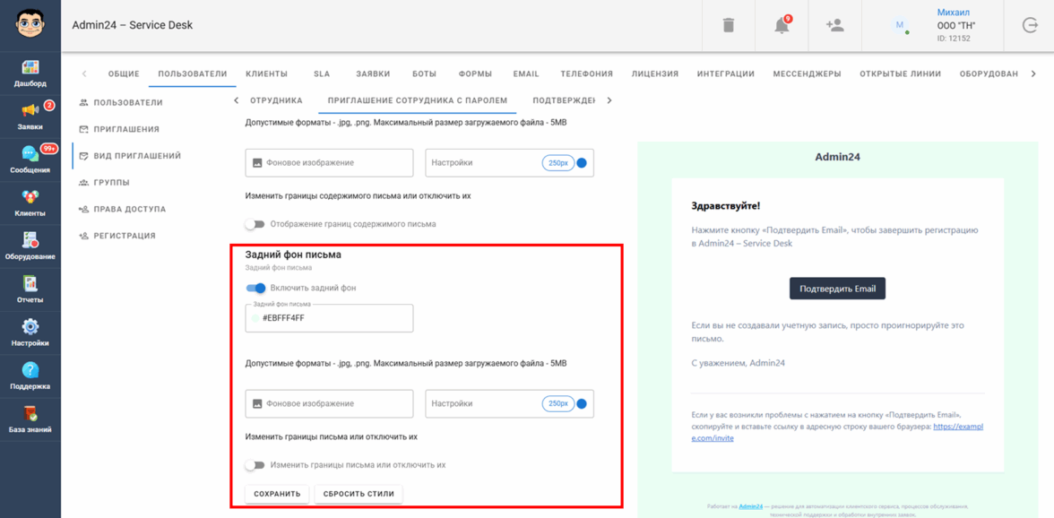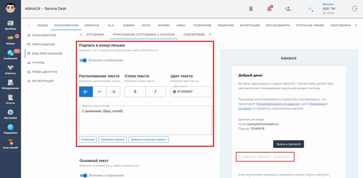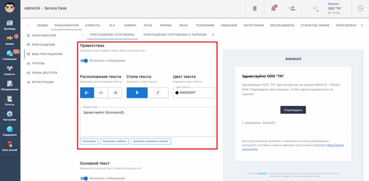 Теперь вы можете кастомизировать письма для приглашения пользователей. Для этого перейдите в раздел «Настройки» → «Пользователи» → «Вид приглашения».