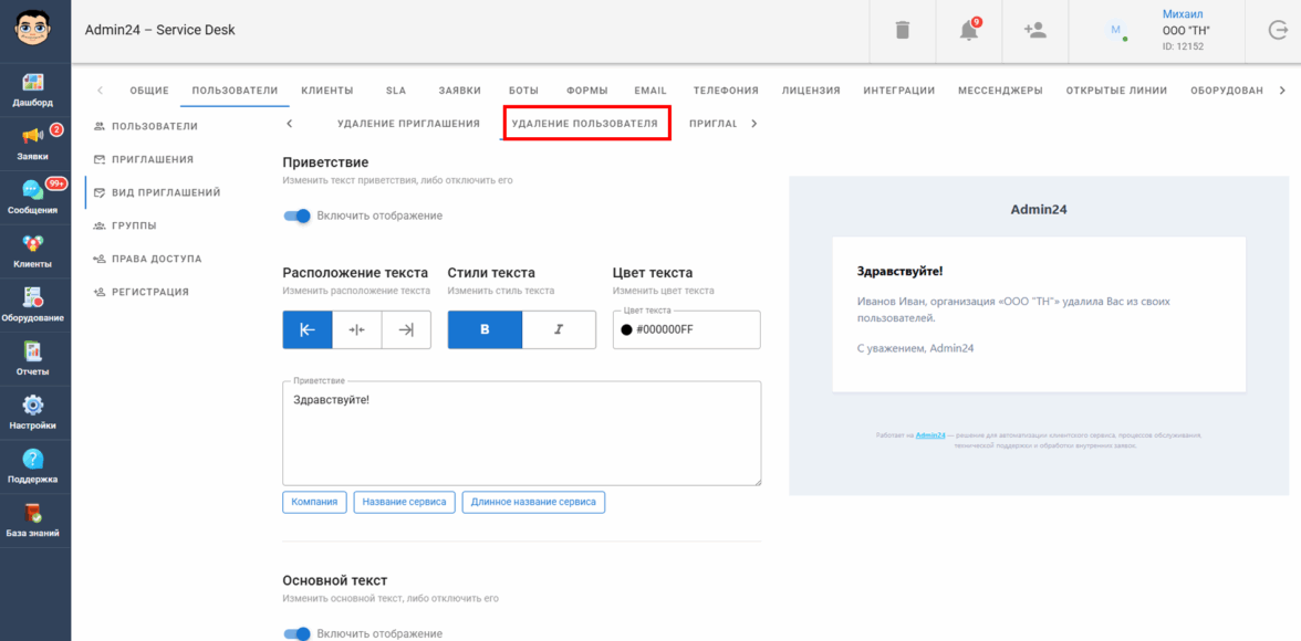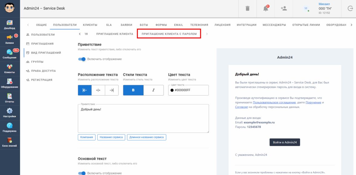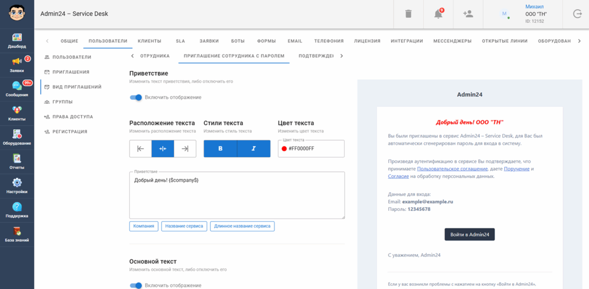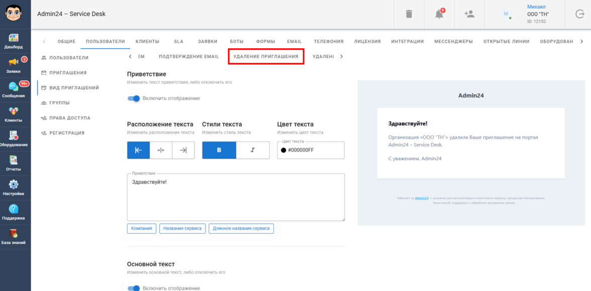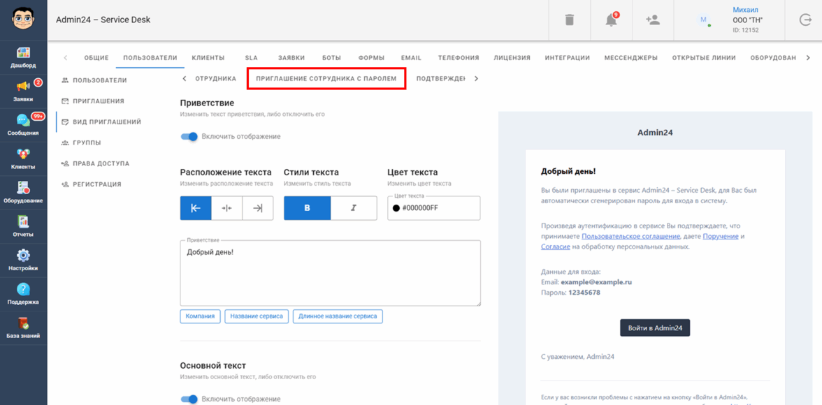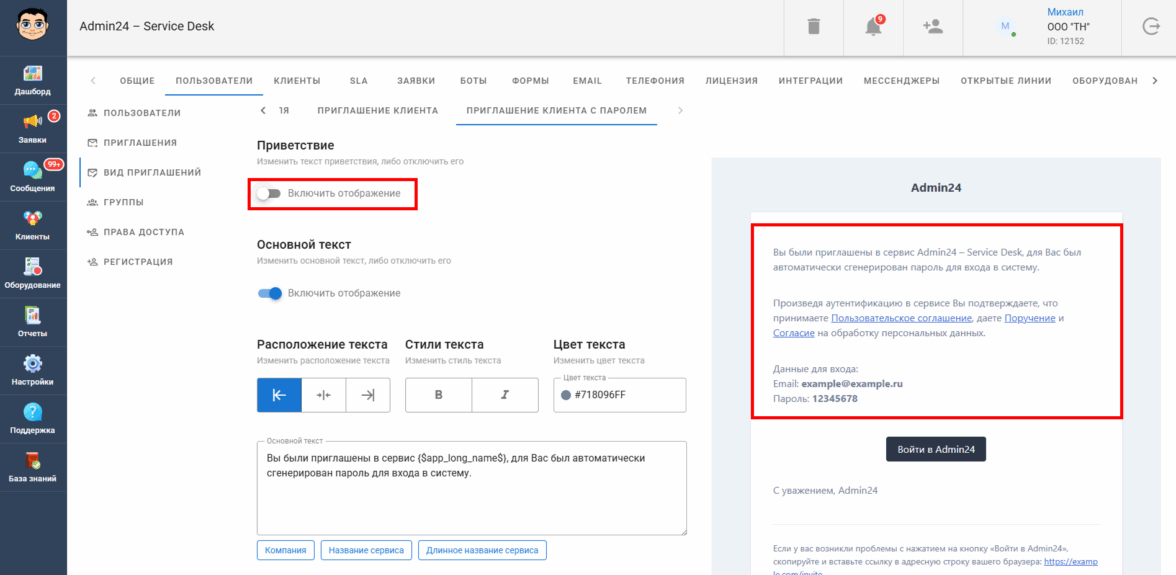 Теперь вы можете кастомизировать письма для приглашения пользователей. Для этого перейдите в раздел «Настройки» → «Пользователи» → «Вид приглашения».
