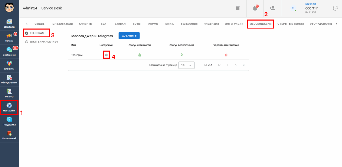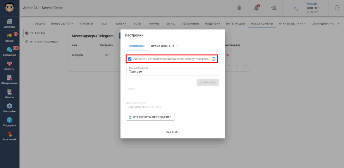 Добавлен функционал ограничения поиска по номеру телефона в Telegram. для этого перейдите в «Настройки» → «Мессенджеры» → «Telegram», кликните по настройкам мессенджера: