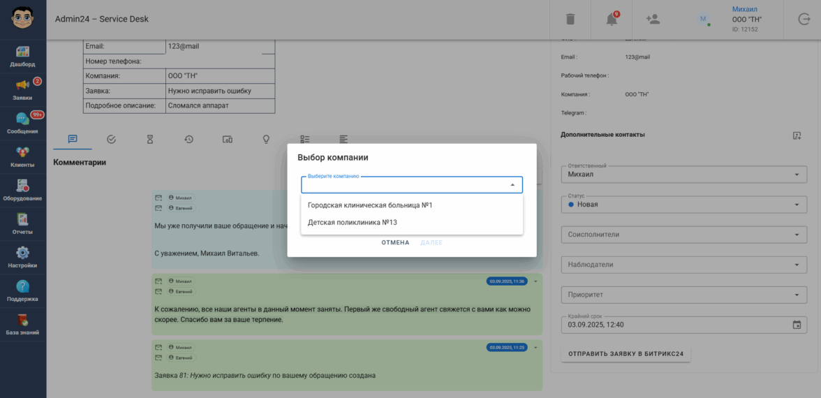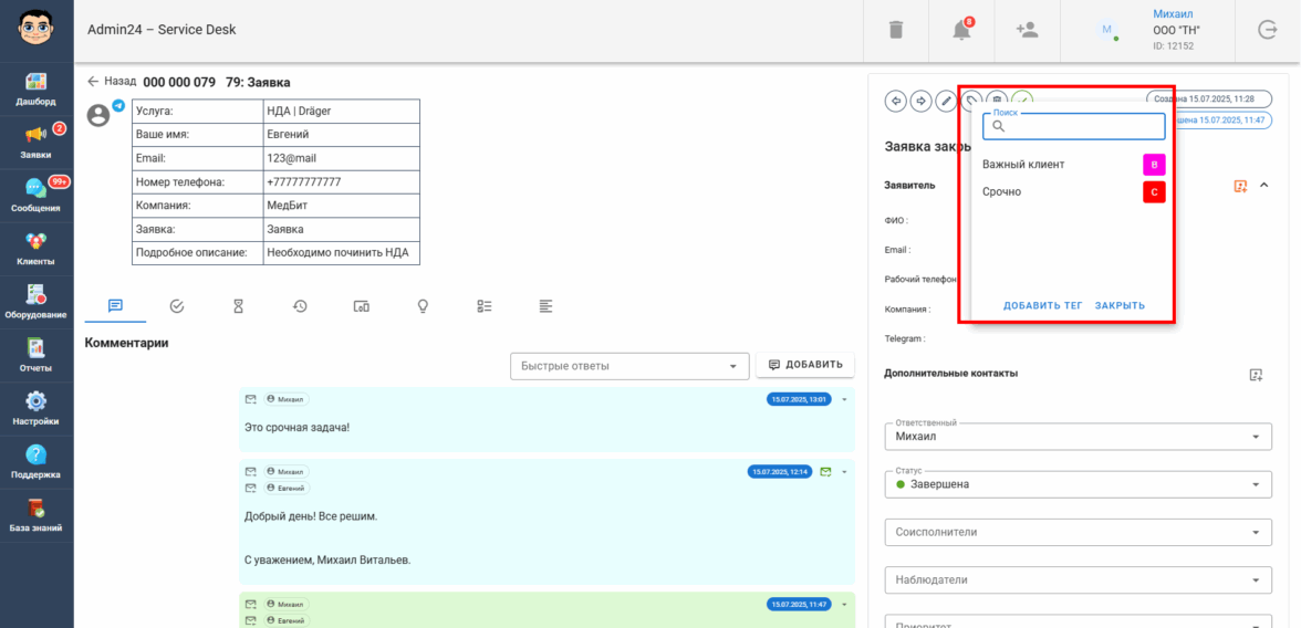 В рамках обновления была произведена корректировка модального окна выбора тегов. Теперь окно выбора тегов в заявке не закрывается автоматически после выбора тега.