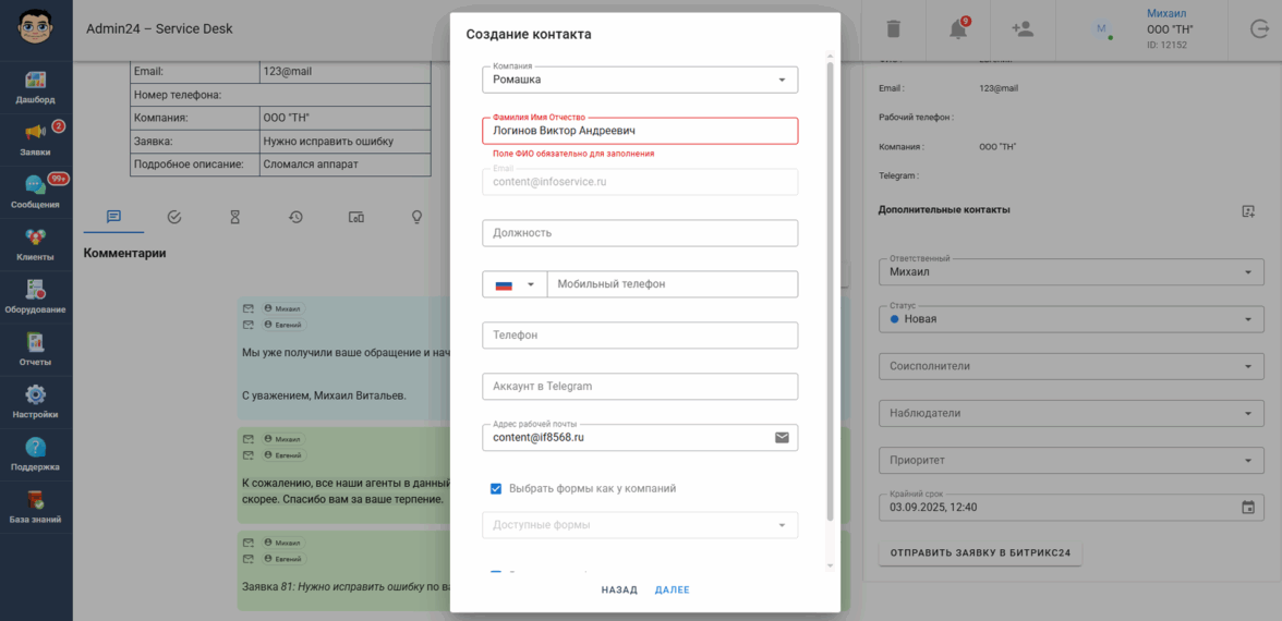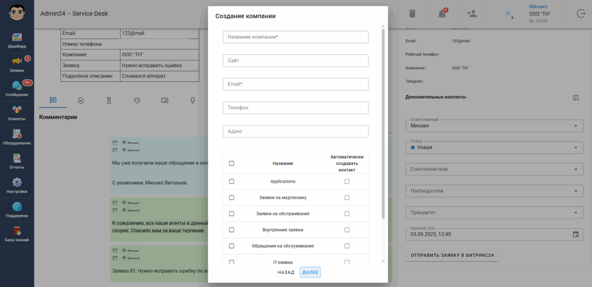 Можно выбрать уже существующую компанию или создать новую, создав при этом и новый контакт.