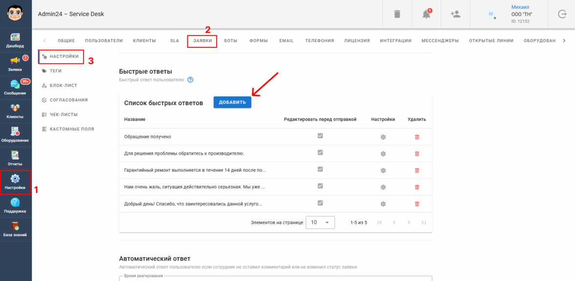 Для шаблонов быстрых ответов добавлено поле «Название». Для настройки перейдите в раздел «Настройки» → «Заявки» → «Настройки». Проскролльте до блока «Быстрые ответы».