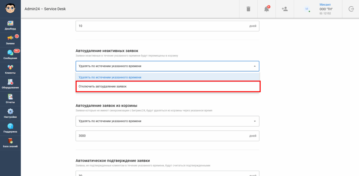 Также в рамках обновления была добавлена возможность отключения автоудаления заявок. Сделать это можно, кликнув по выпадающему списку в блоках «Автоудаление заявок из корзины» и «Автоудаление неактивных заявок» и выбрав «Отключить автоудаление заявок».