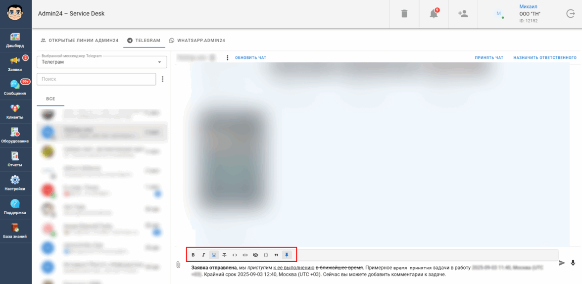В обновлении был добавлен функционал форматирования сообщений для чата Telegram. Для форматирования отправляемого сообщения выделите кусок текста, который хотите изменить. Вверху появится меню, в котором можно выбрать форматирование: