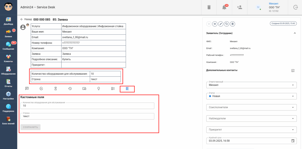 Кастомные поля будут отображаться в детальной карточке заявки под основной информацией по заявке. Заполнить их можно во вкладке «Кастомные поля»: