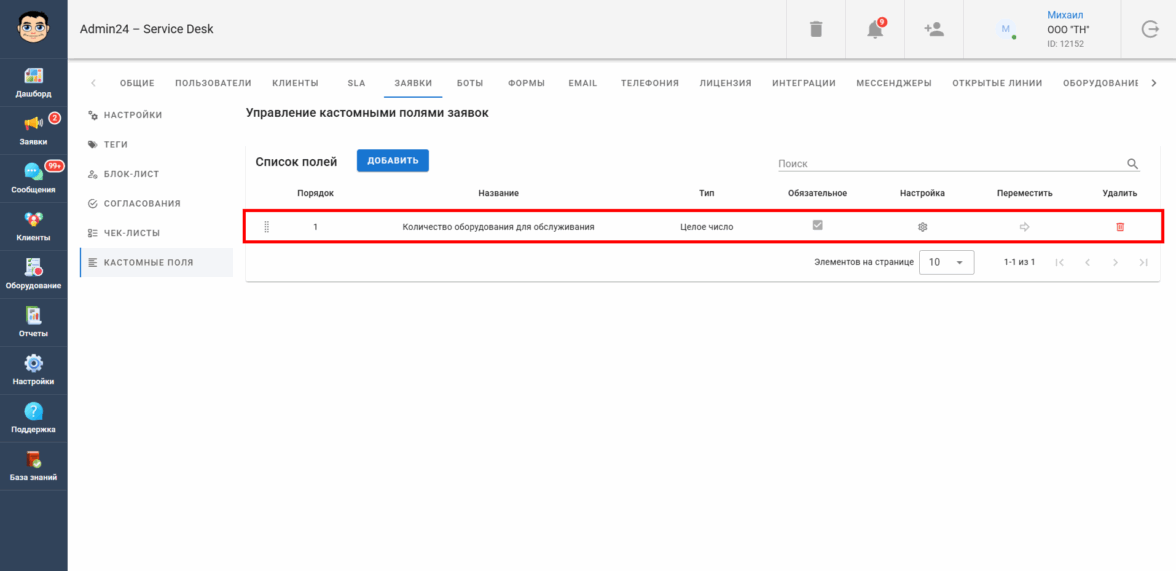 Созданное поле отобразится в списке. Его можно отредактировать, изменить порядок отображения, переместить на следующую страницу или удалить.