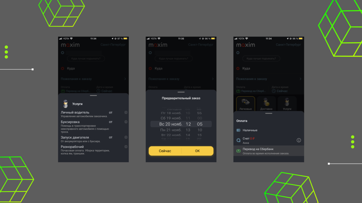 Заказ такси на определённое время и день. Пользователь может планировать поездку за 30 минут или пять дней.