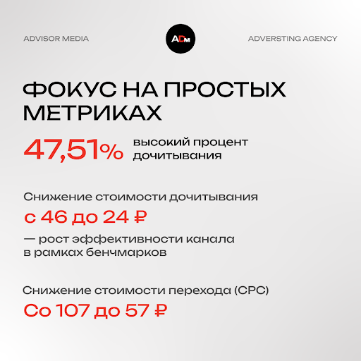 Высокий процент дочитывания (47,51%) показал реальный интерес аудитории к контенту. Снижение стоимости дочитывания с 46 до 24 ₽ — рост эффективности канала в рамках бенчмарков. А снижение стоимости перехода (CPC) со 107 до 57 ₽ в комплексе с оптимальной для клиента стоимостью активаций QR-кода (2170 руб) подтвердило, что качественный контент вместе с работой алгоритмов привлекает недорогой трафик при сохранении качества аудитории.
