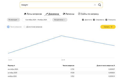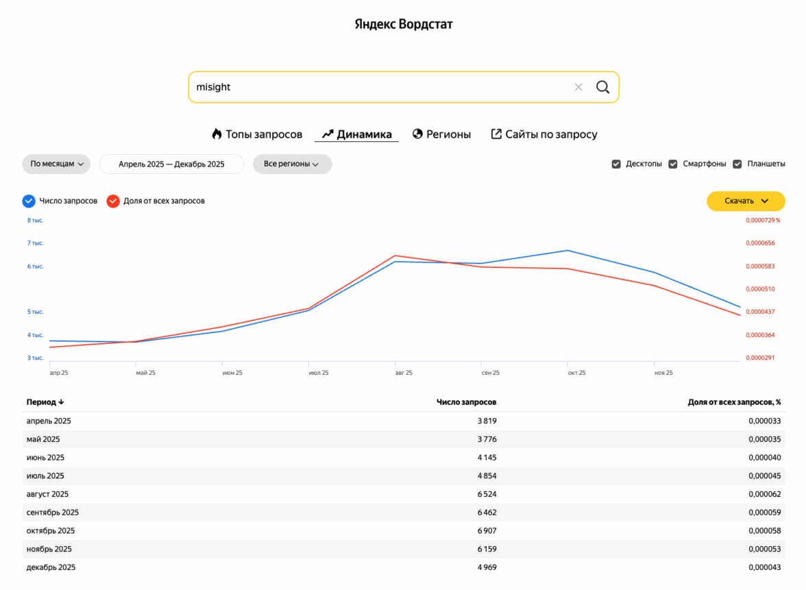 Параллельно вырос интерес к бренду в Wordstat: пик запросов «misight» совпал с периодом активного размещения.
