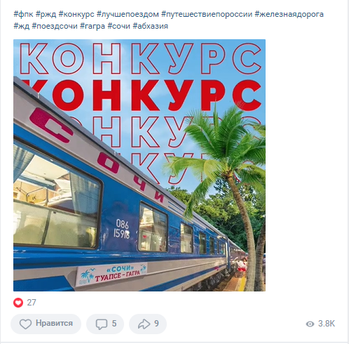 Сотрудничеству с аккаунтами лидеров мнений также уделили особое внимание. Публиковали контент у тревел-блогеров, посвященный туристическим поездам и делали совместный с Ростуризмом постинг о железнодорожных туристических проектах.Провели конкурс, посвященный поезду в Сочи.