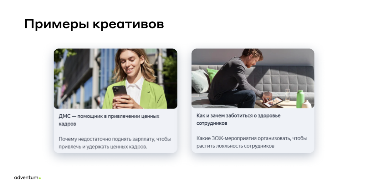 • Применяли разные виды таргетинга: ретаргетинг по посетителям бизнес-разделов сайта, таргетинг по тем, кто посетил страницу корпоративного ДМС без заявки, и по интересам, связанным с бизнесом.