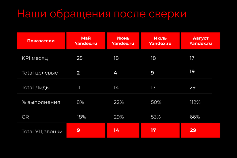 По итогу месяца цена качественного лида снизилась в 2,2 раза. Количество первичных лидов выросло до 17, а качественных — до 9. Конверсия из первичного лида в качественный выросла с 29 до 53%.