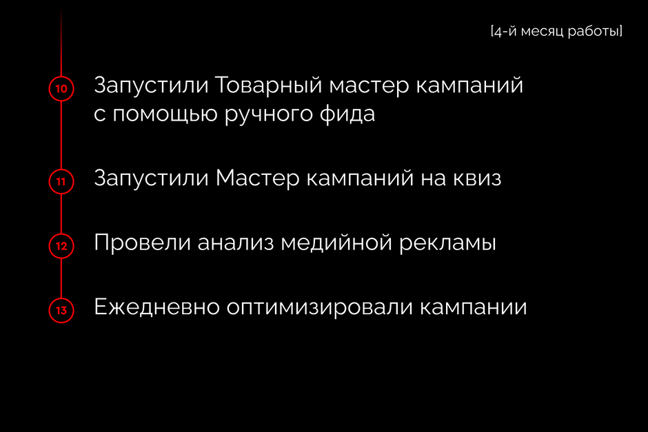 Далее агентство запустили «Товарный мастер» кампаний с помощью ручного фида. К концу месяца получили четыре качественных лида.
