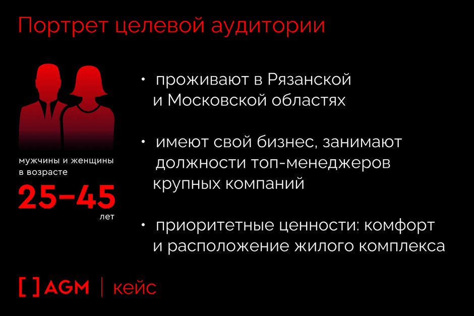 Целевая аудитория проекта — обеспеченные мужчины и женщины в возрасте 25–45 лет, проживающие в Рязанской и Московской областях. Они либо имеют свой бизнес, либо занимают должности топ-менеджеров крупных компаний. Приоритетные ценности для них — комфорт и расположение жилого комплекса.