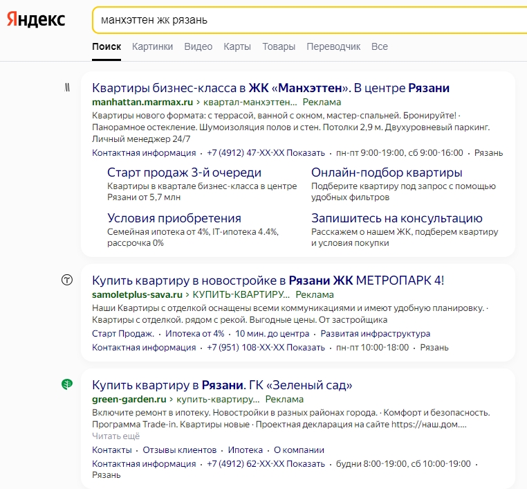 В начале работы специалисты по контекстной рекламе провели анализ конкурентов «Манхэттена» в поисковой выдаче и выделили наиболее привлекательные УТП. Выявили, что цены по ЖК «Манхэттен» в два раза выше, чем в объявлениях конкурентов, поэтому решили не акцентировать на них внимание.