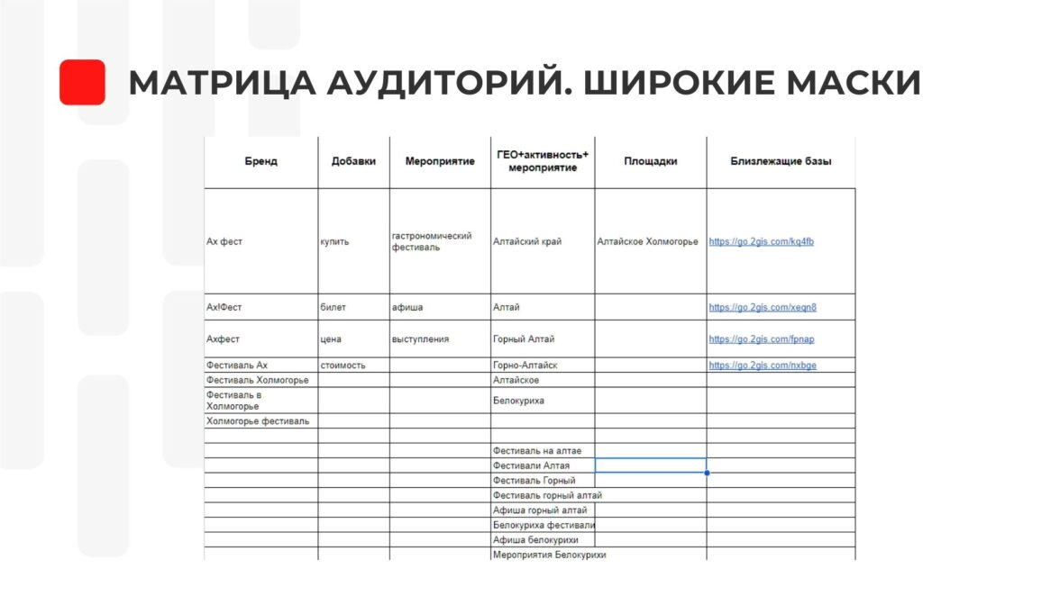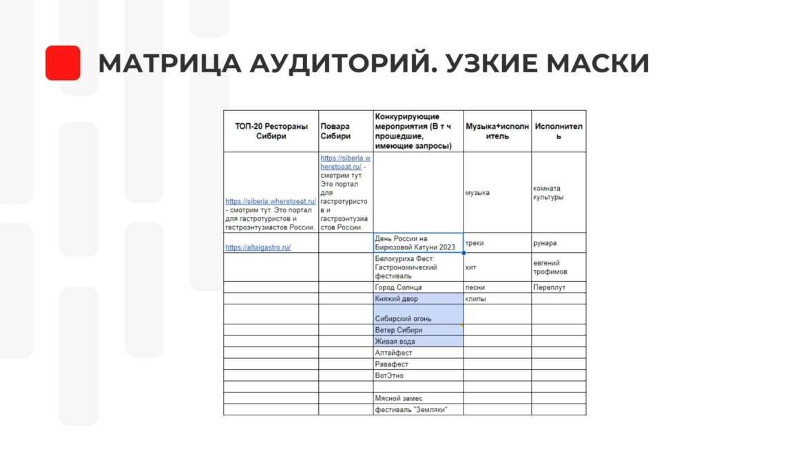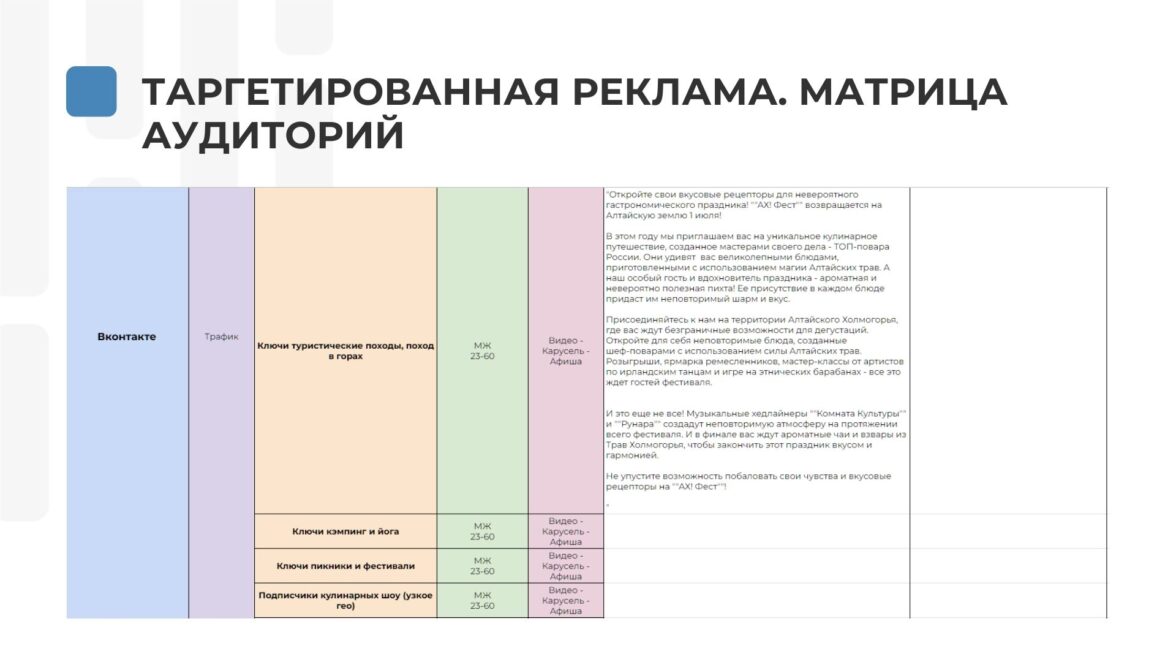 Целевая аудитория — бренд мероприятия и горячая аудитория, ключи по фестивалям и отдыху в горном Алтае.