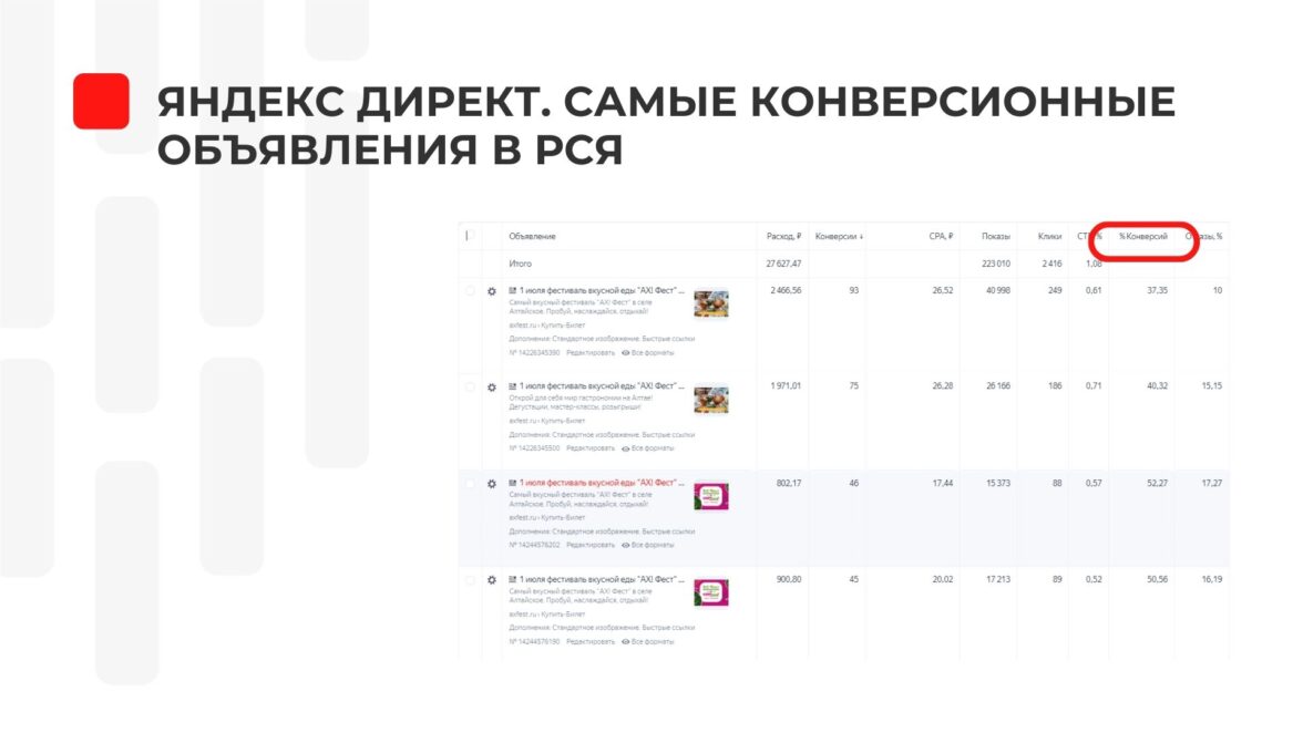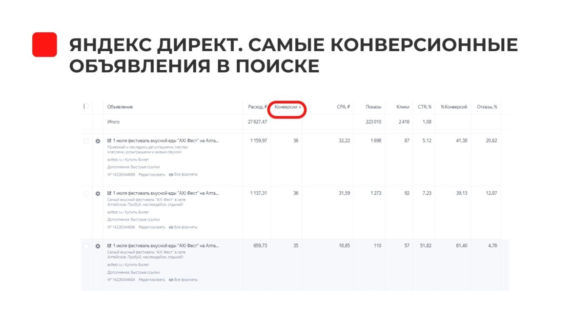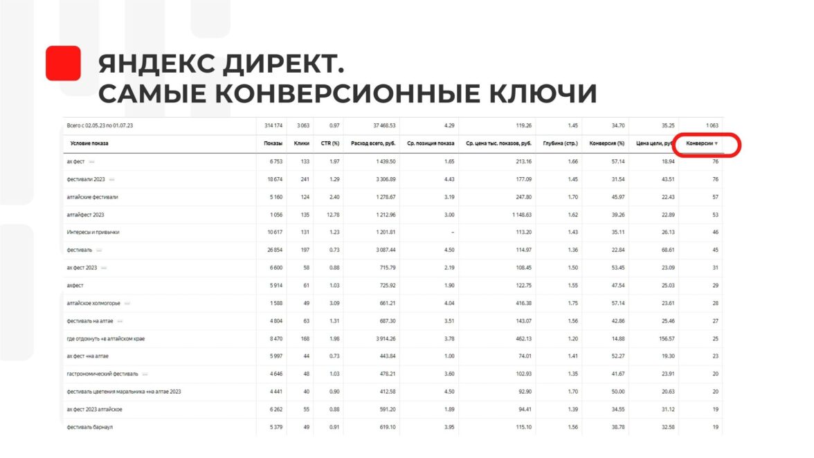 1. В Яндекс. Директ больше всего продаж дали следующие стратегии: Поиск — узкое ГЕО, ключ «ах фест». По РСЯ самым конверсионным был ключ — «семейный отдых на Алтае с детьми летом».