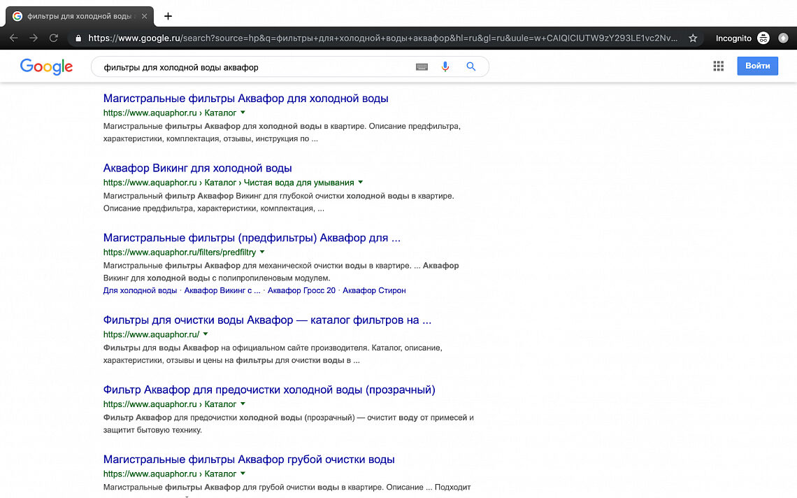 Пример увеличения видимости сайта по брендовому запросу «фильтры для холодной воды аквафор». АКВАФОР занял весь топ-10 выдачи. Наша ближайшая цель — достичь такого же результата для максимального числа брендовых запросов