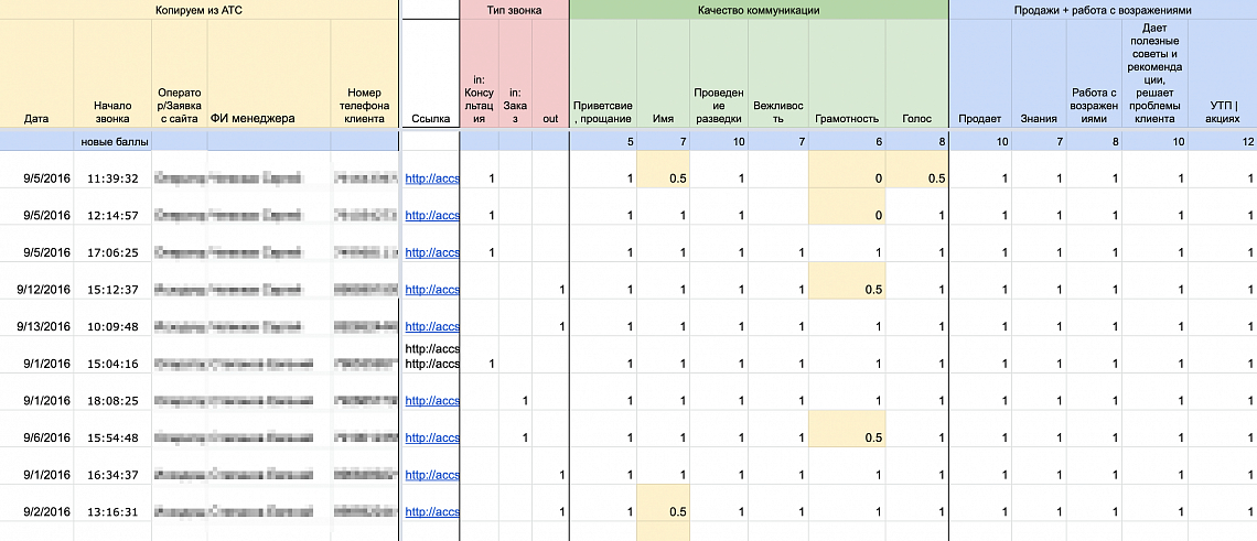 Затем разработали и помогли команде АКВАФОР внедрить скрипт разговоров по телефону. После этого регулярно прослушивали звонки и заполняли таблицу оценки по каждому оператору.