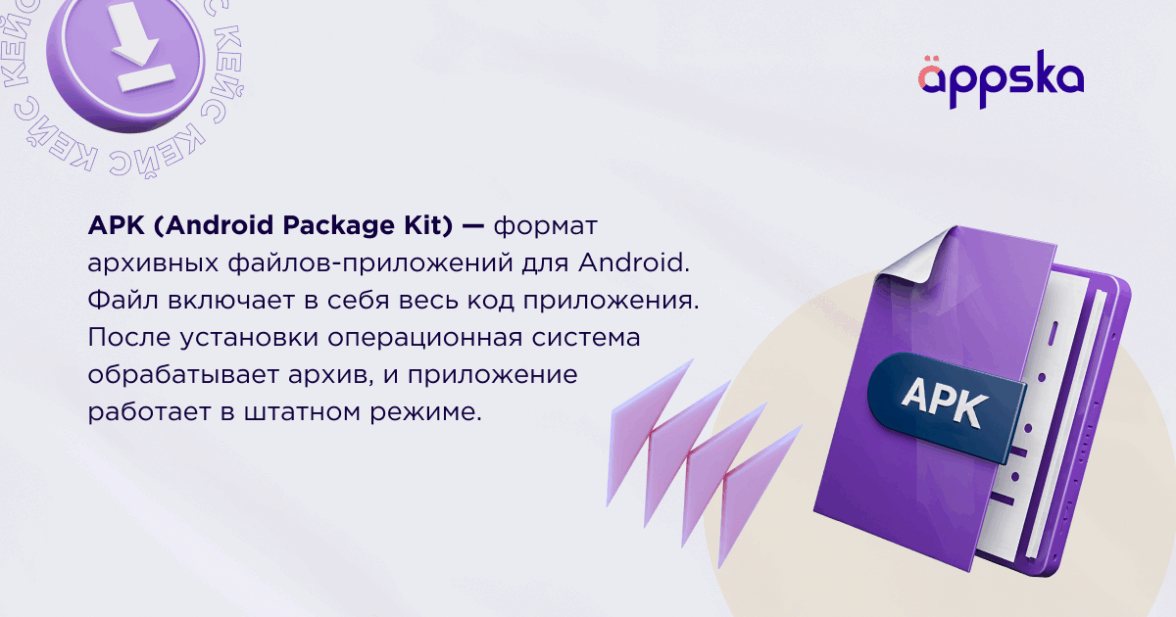 APK (Android Package Kit) — формат архивных файлов-приложений для Android. Файл включает в себя весь код приложения. После установки операционная система обрабатывает архив, и приложение работает в штатном режиме.