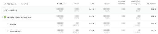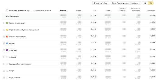 Отчет по интересам из медийной Метрики на основе медийной рекламы ARXY. К текущим интересам добавили «Финансы», так как коэффициент конверсии выше, чем у интересов «Строительство, обустройство и ремонт»