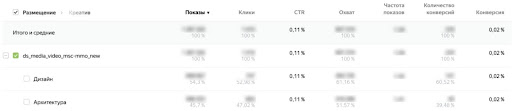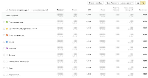Отчет по интересам из медийной Метрики на основе медийной рекламы ARXY. К текущим интересам добавили «Финансы», так как коэффициент конверсии выше, чем у интересов «Строительство, обустройство и ремонт»