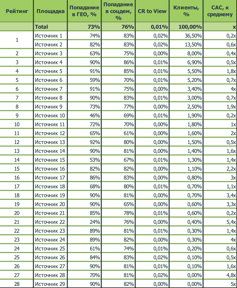 Число новых клиентов, приведенных с каждой площадки. Для подсчета количества клиентов использовали несколько моделей атрибуции — как к последнему источнику показа рекламы, так и к первому показу. В процессе — формирование собственной модели на основании различных весов каждого контакта. На основании фактического количества клиентов, распознанных Операторами Сотовой связи, достроили экстраполяцию по числу клиентов, взаимодействующих с Digital Media. Для экстраполяции использовали открытые данные по покрытию рынка операторами сотовой связи. Для оценки конверсии вывели метрику CR-to-view, которая оценивает конверсию из показов в клиентов по каждому источнику показа рекламы. Оценили CAC по распознанным клиентам от расходов на Digital Media. Стоимость привлеченного нового клиента сопоставимы с Performance — каналами, а с учетом экстраполяции на других операторов — дешевле в 2 раза. По итогам проведенных расчетов вывели рейтинг эффективности рекламных площадок, которые принесли реальный бизнес-результат: