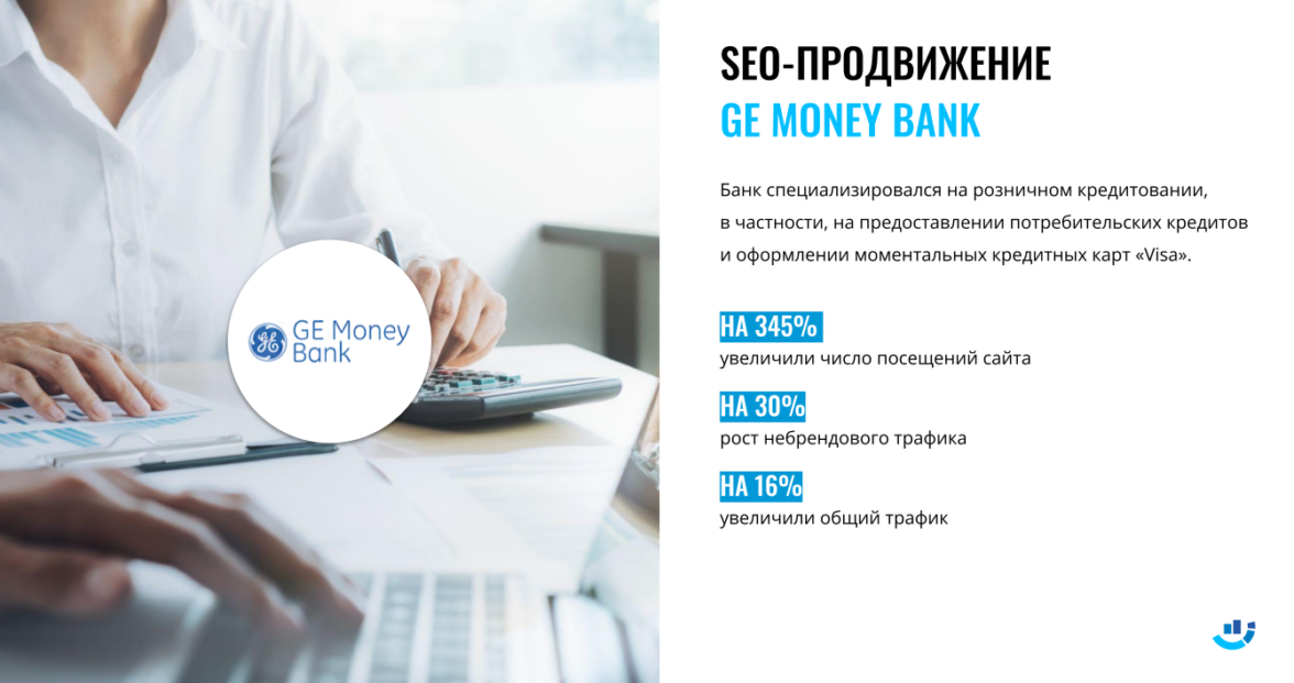 Благодаря нашей команде пользователи стали с легкостью находить Ge Money Bank через поиск. Добиться этого помогло: