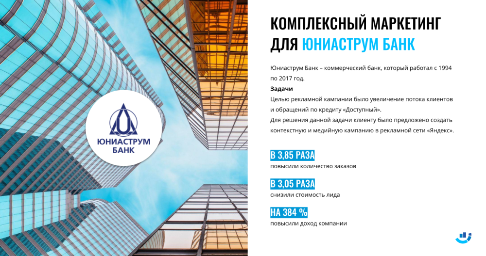 Кейс: банковская сфера. Продвижение сайта «Юниаструм Банка». На 384% повысили доход финансового продукта