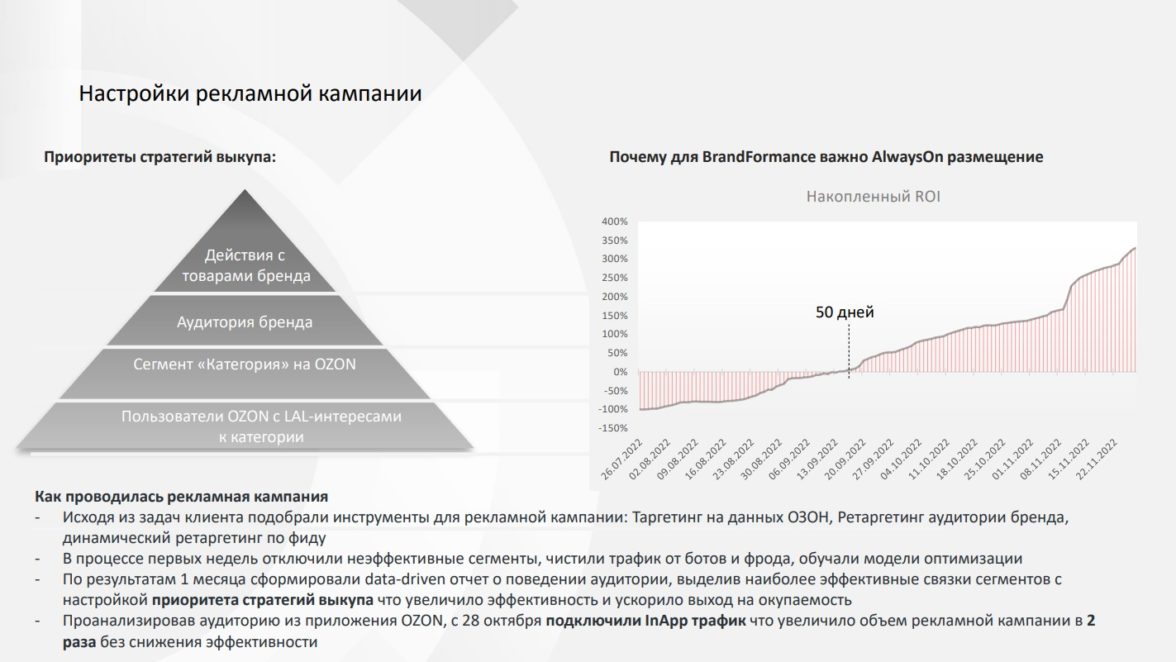 В первые недели мы занимались оптимизацией: отключали неэффективные сегменты, чистили трафик от ботов и фрода, обучали модели оптимизации. В конце первого месяца у нас был сформирован data-driven отчет о поведении аудитории. Мы выделили наиболее эффективные связки сегментов с настройкой приоритета стратегий выкупа, что увеличило эффективность и ускорило выход на окупаемость. В течение 50 дней мы сумели выйти «в плюс».
