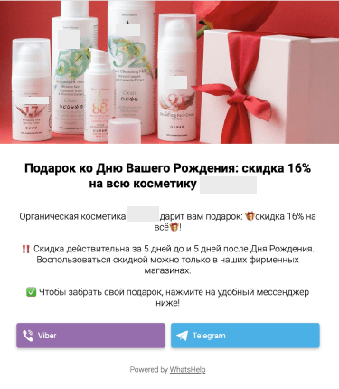 Скидка на день рождения за подписку в чат-бота. Этот вариант был придуман как дополнительный источник получения заявок, так как был рассчитан на более узкую аудиторию, у которой дни рождения в ближайшее время.