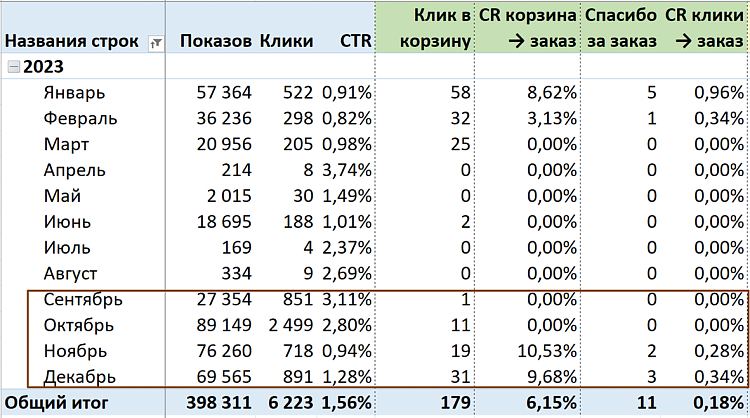 В сентябре запустили РК с креативами из нейросети. После периода затишья из «выгоревшей» рекламной кампании мы стали получать клики в корзину, а затем и в заказ