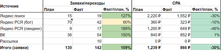 Скриншот показывает результат экспериментальной рекламной кампании. План по количеству заявок мы выполнили на 109 %