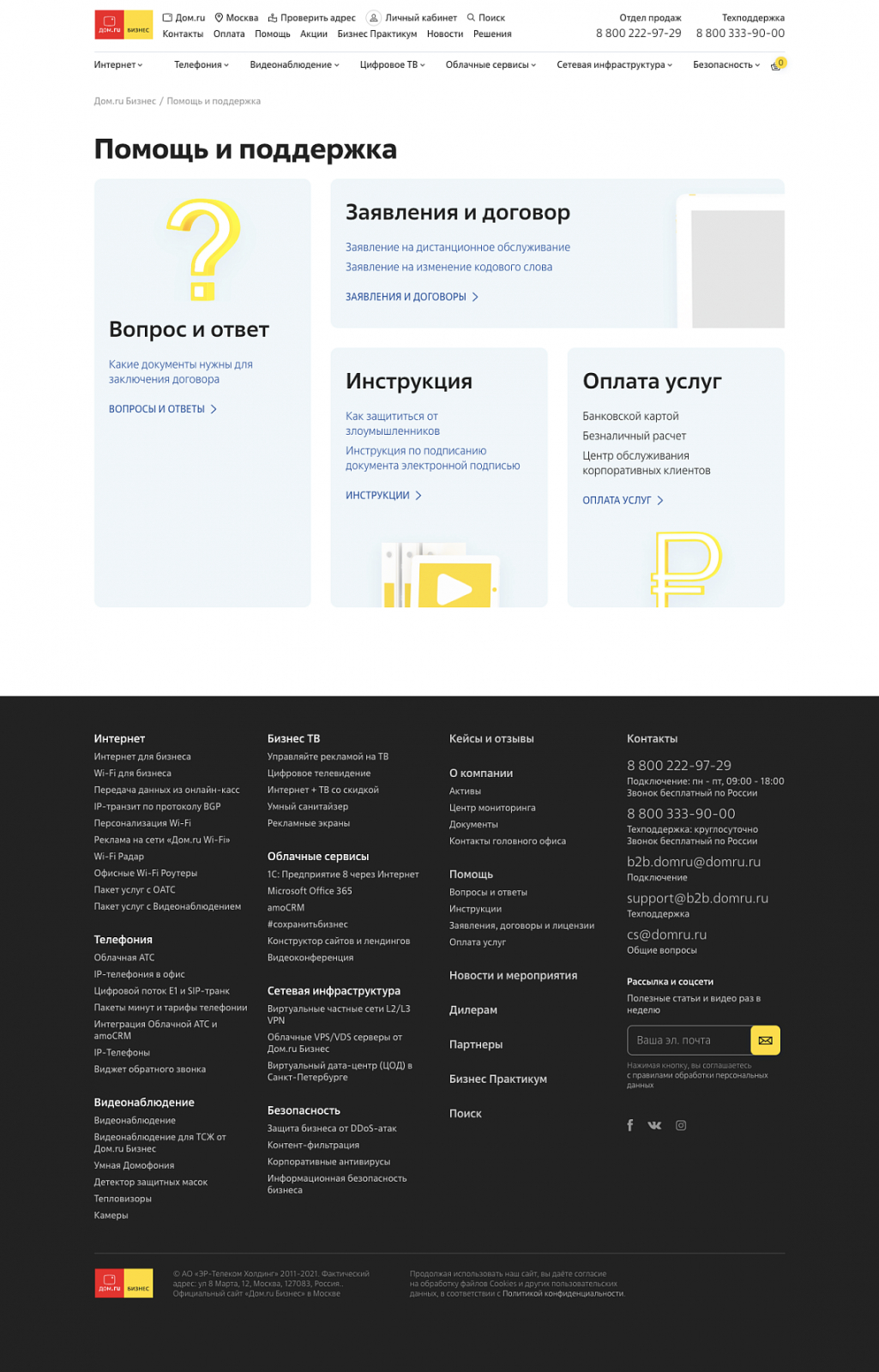 Во главе сайта стоят клиенты. Они рассказывают, как Дом.ru Бизнес помогает им усиливать работу их компании, какими продуктами они пользуются, что больше всего ценят и так далее.