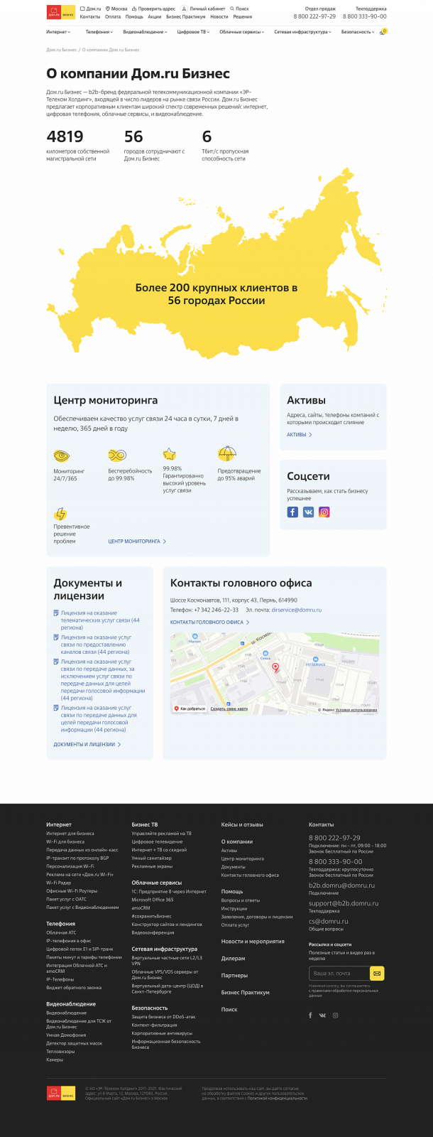 На странице можно узнать о новостях Дом.ru Бизнеса, найти контакты, ссылки на социальные сети, все необходимые документы и лицензии и задать вопрос.