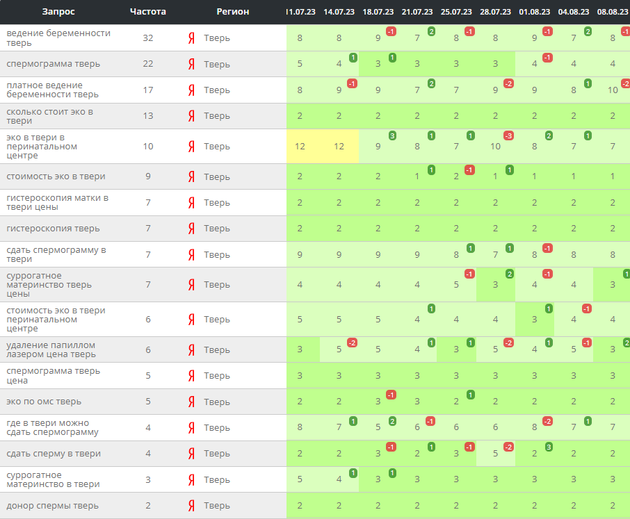 Именно здесь сыграло роль выгодное местонахождение клиники: мы вплотную работали с геонезависимыми запросами, включив туда топонимы «в Твери», «Тверь». Благодаря этому клинику могли видеть в Сети потенциальные пациенты из Москвы и Подмосковья — те, кому добираться до клиники сравнительно недолго, зато крайне выгодно по причине сниженных цен.