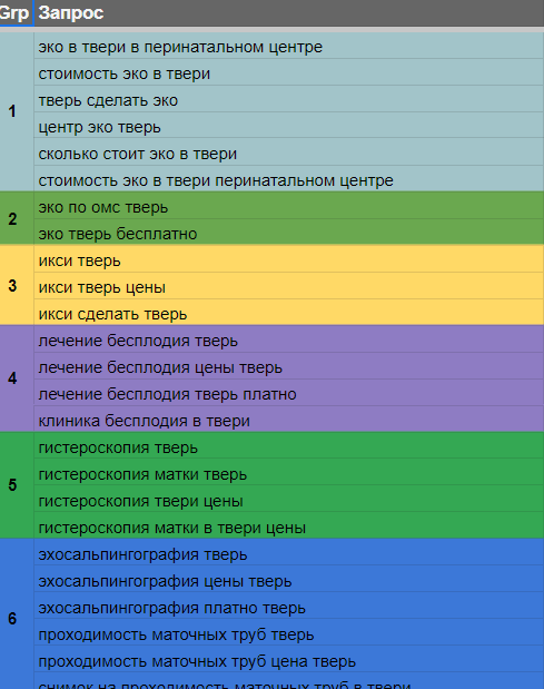 Затем мы проработали семантическое ядро — собрали и кластеризовали поисковые запросы, четко характеризующие позиционирование клиники и при грамотном применении работающие на распознавание ее преимуществ для алгоритмов поисковиков и потенциальных пациентов.