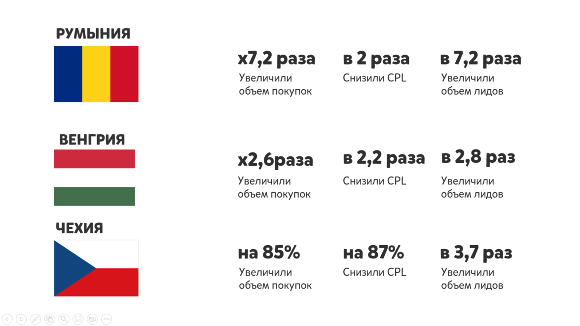 Часто при масштабировании задействуются более холодные сегменты аудитории, и приходит не очень качественная ЦА — число лидов растет, а объем покупок увеличивается незначительно.В нашем случае, спускаясь вниз по воронке мы приводили все более горячую аудиторию — таким образом мы увеличили не только количество лидов, но и количество покупок. Например, в Румынии мы в 7,2 раза увеличили количество лидов и в 7,2 раза увеличили объем покупок. В Венгрии рекламная кампания принесла увеличила число лидов в 2,8 раз, а число покупок — в 2,6 раза.