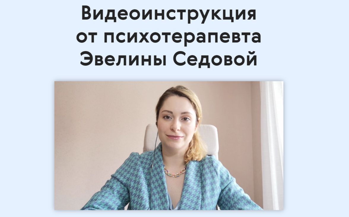 Первым материалом курса стала видеоинструкция от Эвелины Седовой — одного из психотерапевтов сервиса. В ней специалист рассказывала о том, как работает психология, с чего нужно начать и о том, как понять, что нужно обратиться к психотерапевту. Для первой точки касания участников с проектом мы выбрали именно видео, как понятный и цепляющий формат.