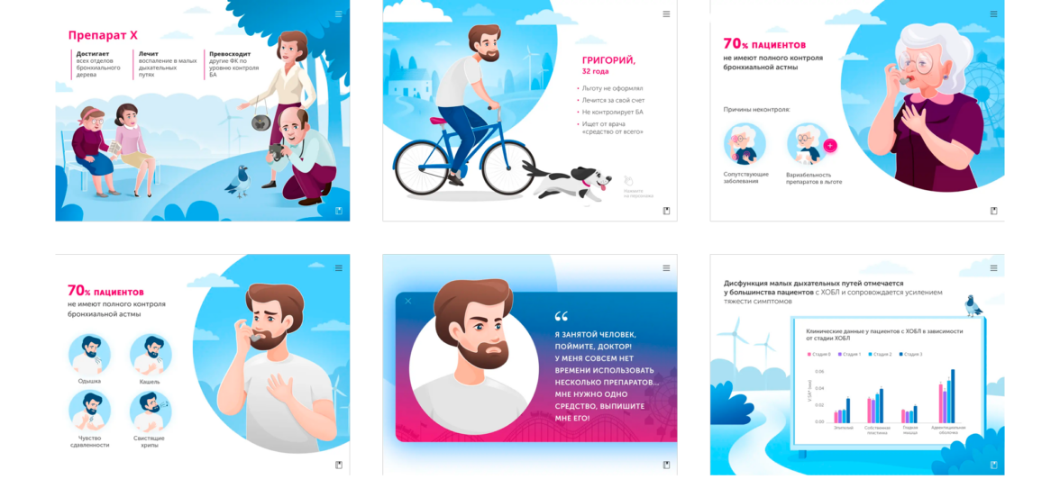 Для того чтобы врач не только запомнил ключевые сообщения, но и ощутил эмоциональную удовлетворенность от коммуникации с брендом, мы использовали метод сторителлинга. Эмоции в медицинском контенте важны, но безусловно есть и очень важная научная часть материала, которая также представлена живо и нестандартно. Даже обычные графики превращаются в объекты городской и парковой среды.